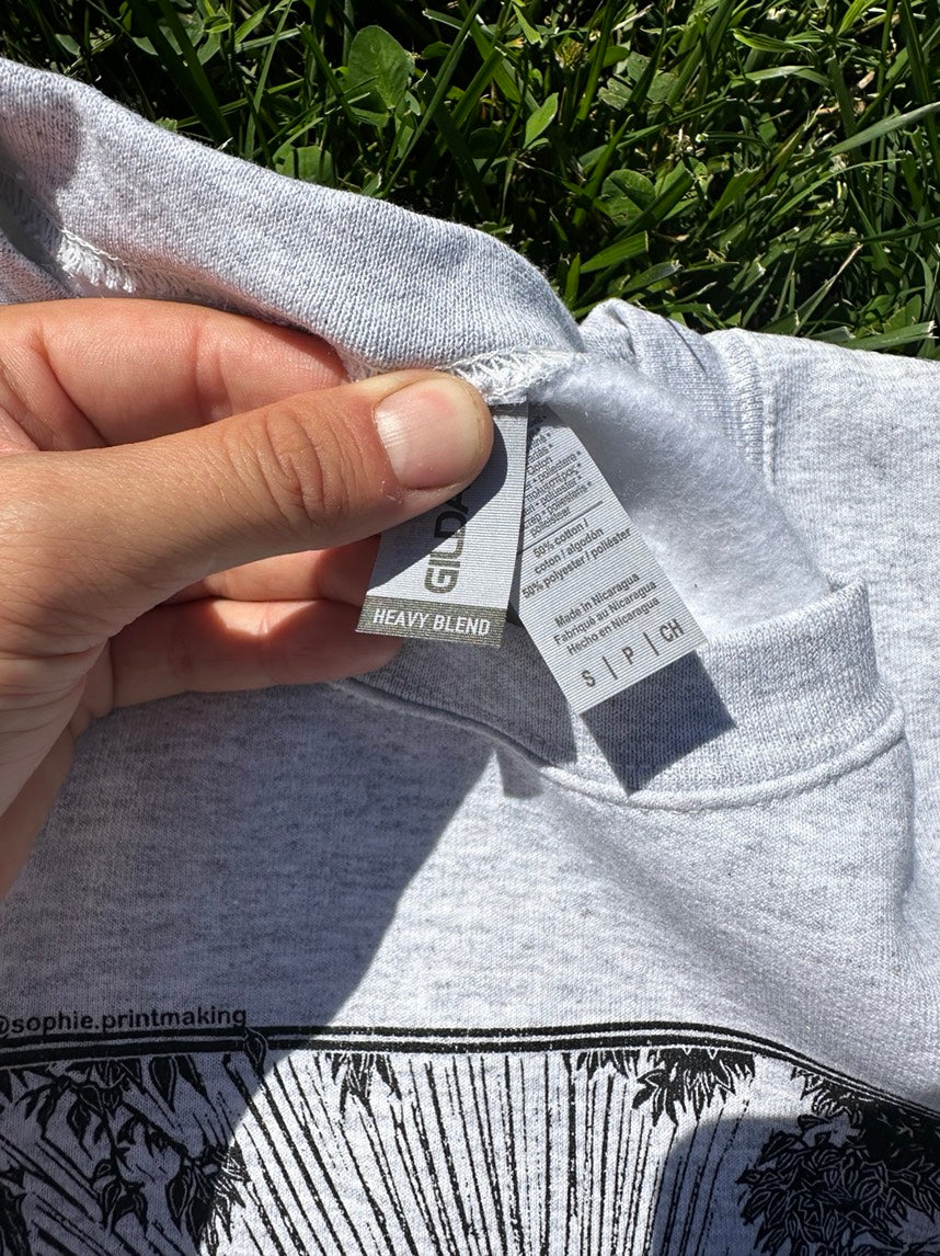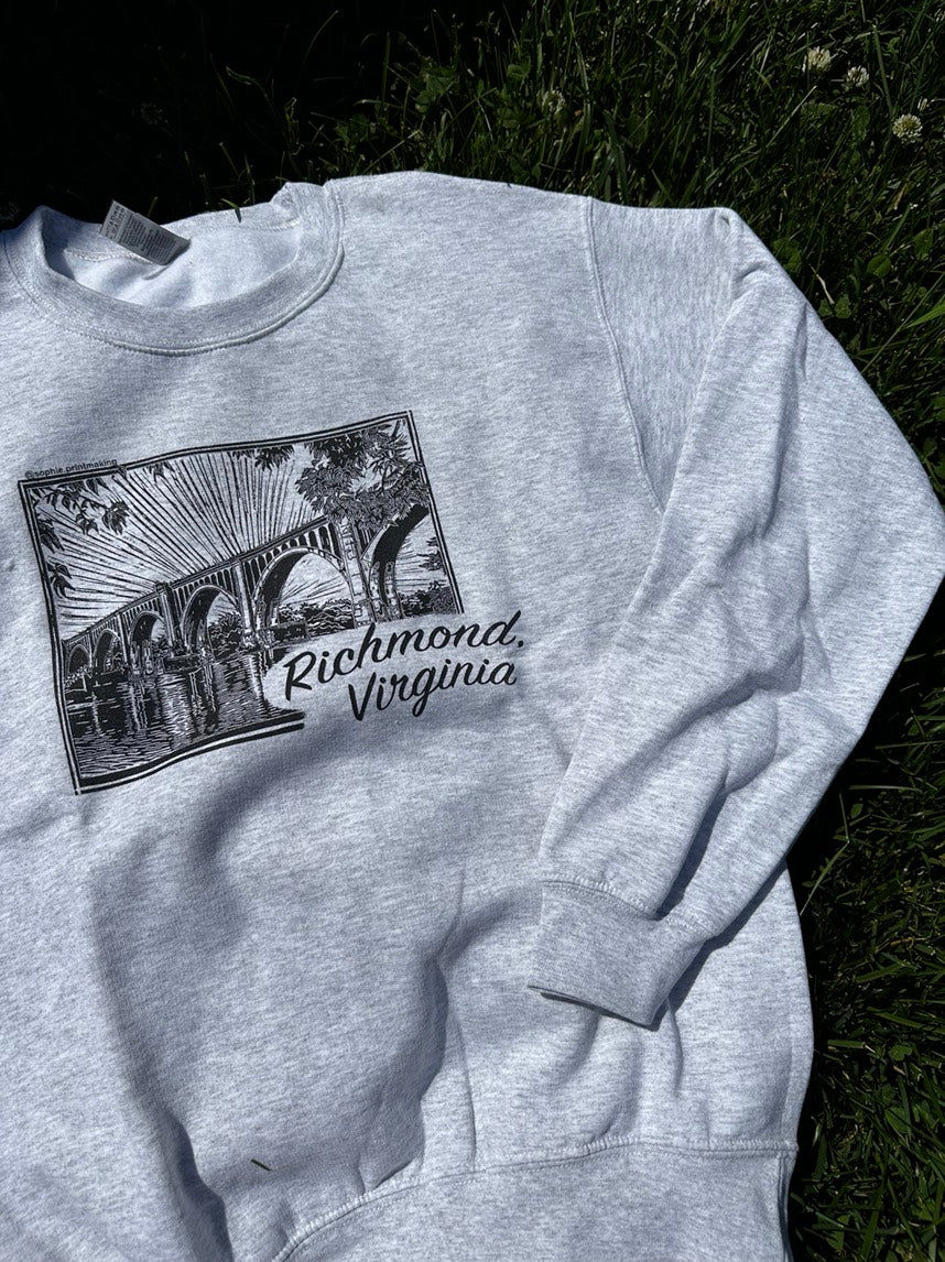 ACL Railroad Bridge image on gray unisex Gildan Heavy Blend Crewneck Sweatshirt. 50% Cotton, 50% Polyester.