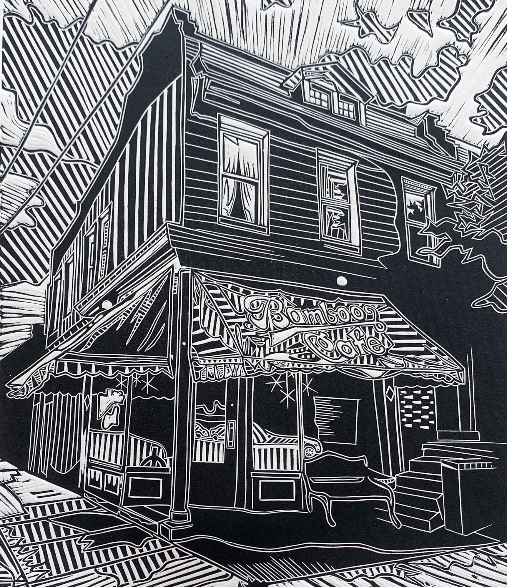 This linocut image was carved by hand, and printed using Speedball Oil-Based Ink on Fabriano Paper. Titled and signed by the artist in pencil, frame and matte NOT included.