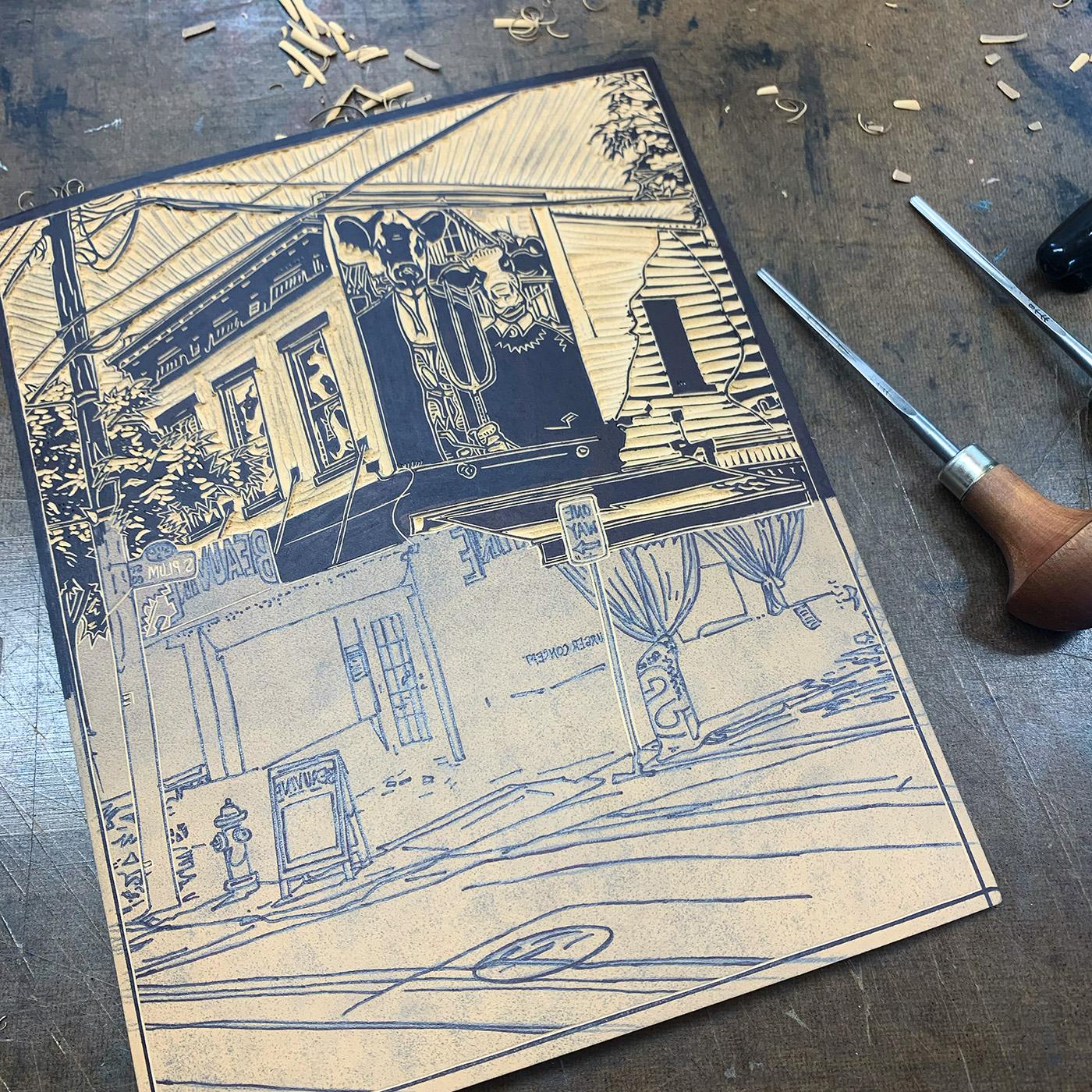 This linocut image was carved by hand, and printed using Speedball Oil Based ink on Fabriano paper. Titled & signed by the artist in pencil, frame and matte NOT included.
