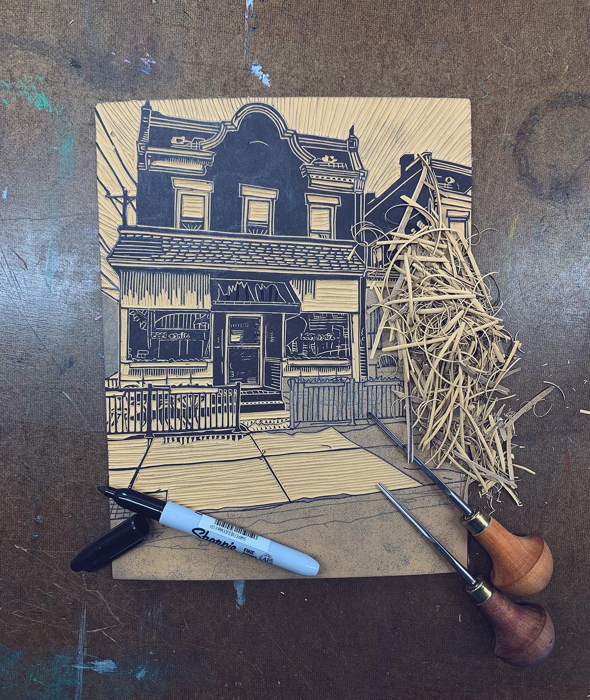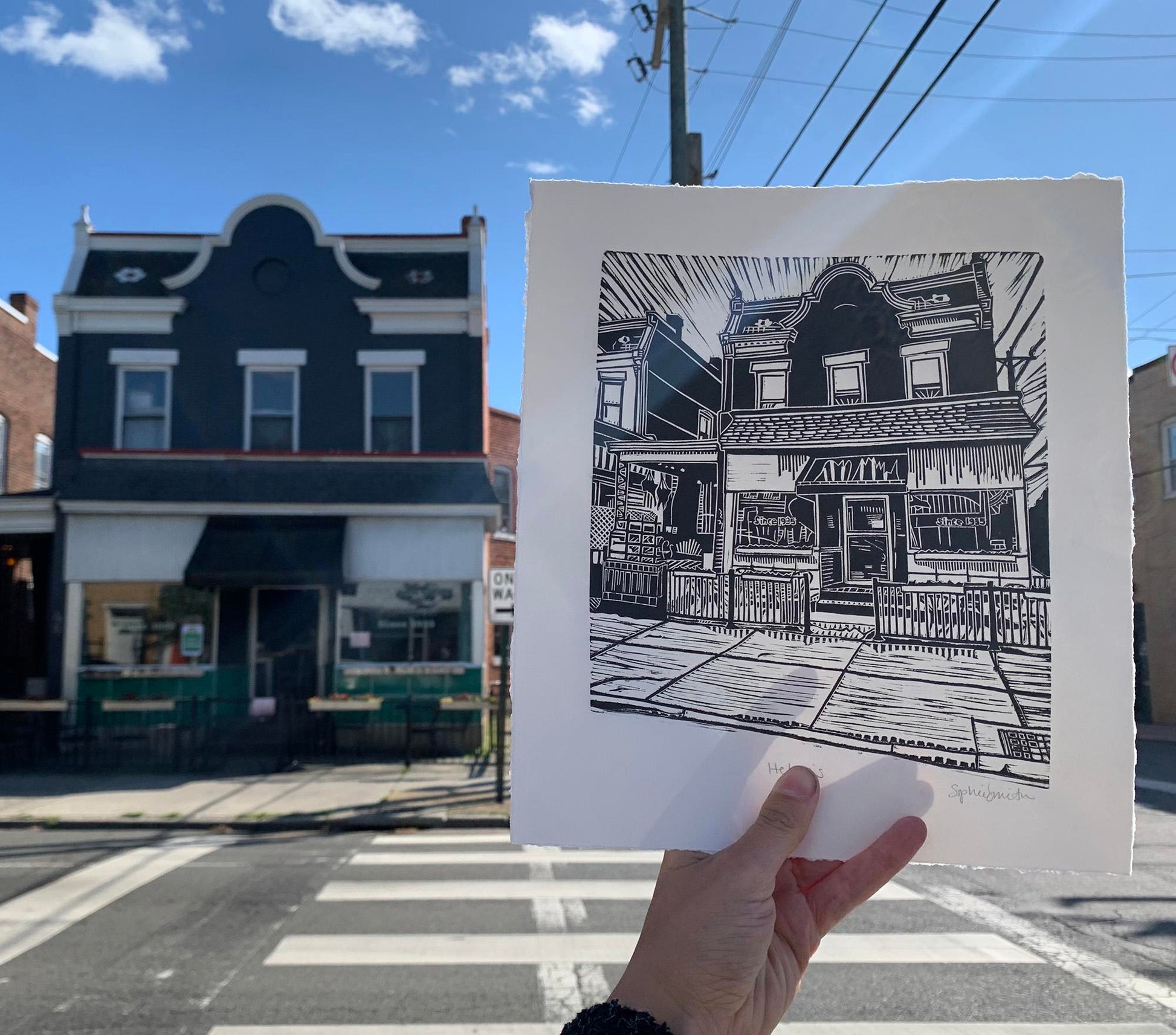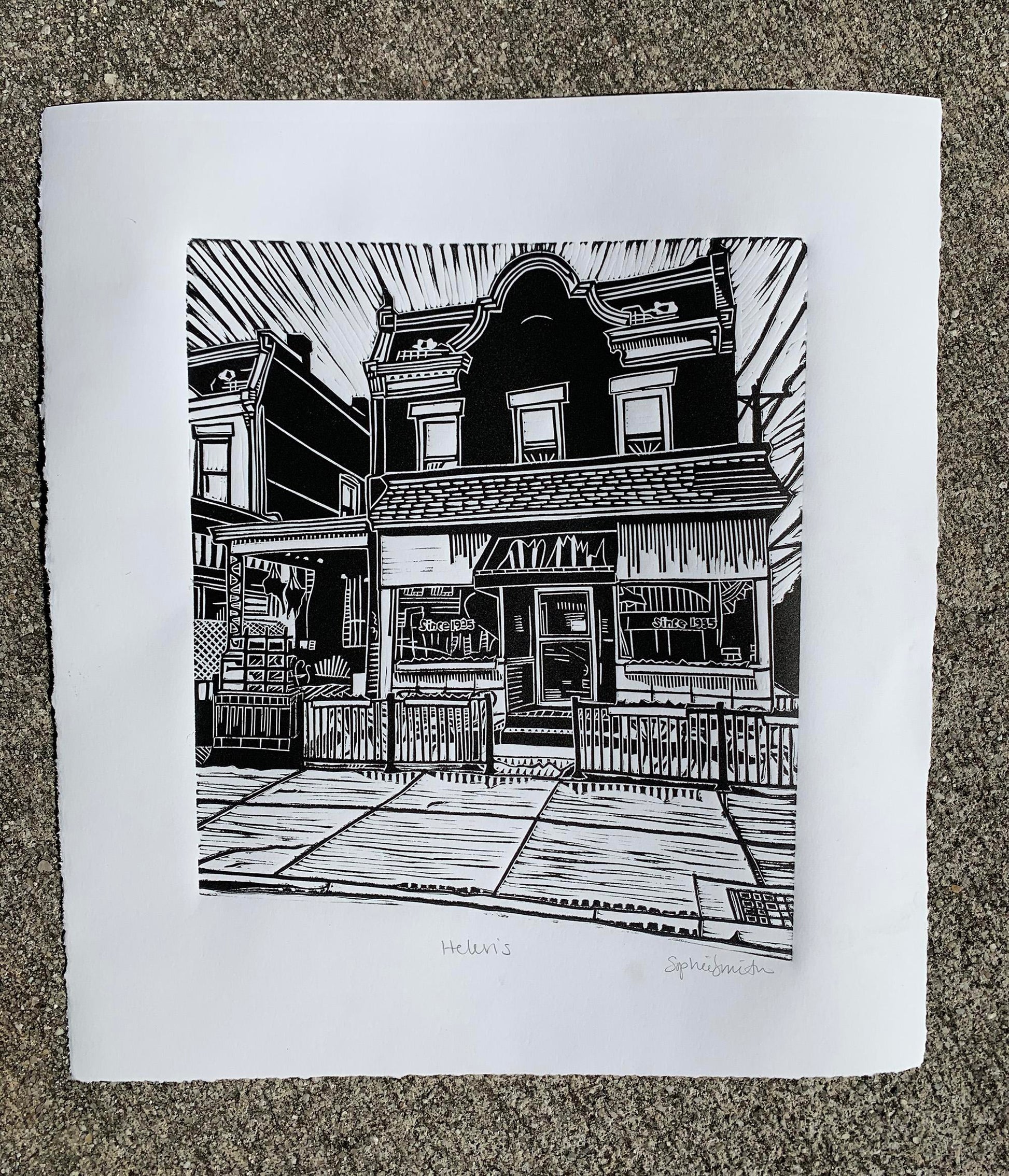 This is an 8X10" linocut print of the restaurant, Helen's located in The Fan District of Richmond, VA! Titled and signed by the artist in pencil. Frame and matte NOT included.