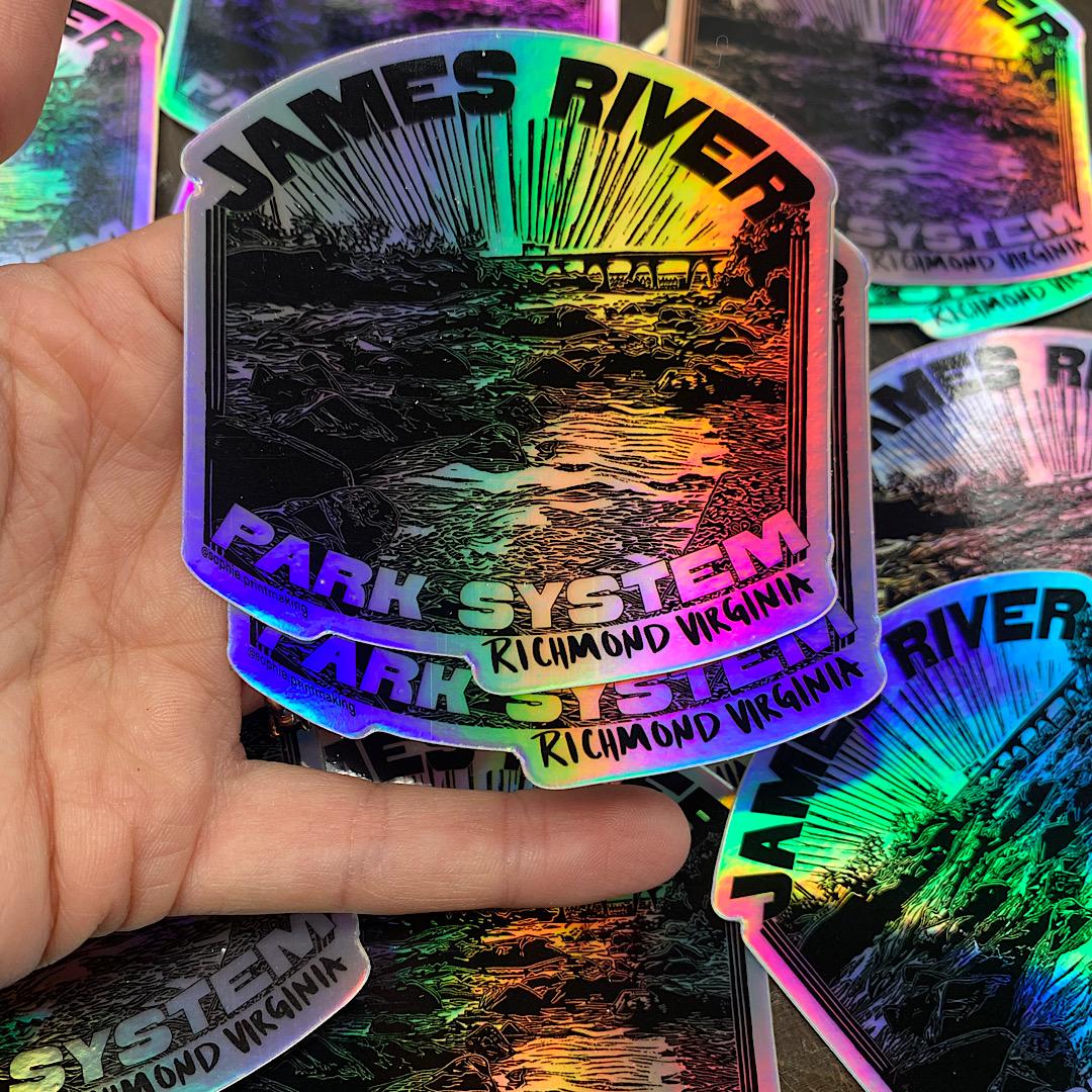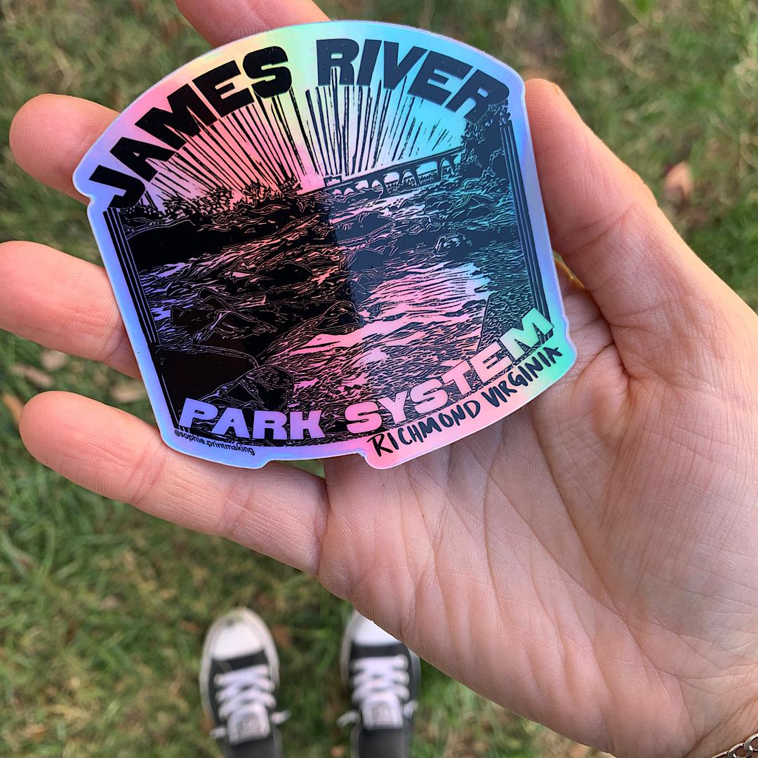 Featuring the Pipeline Walkway linocut print on a holographic sticker.