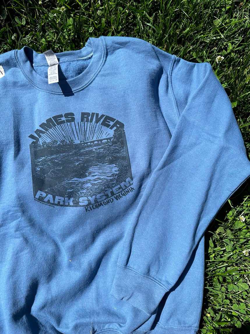 James River Park System image on blue unisex Gildan Heavy Blend Crewneck Sweatshirt. 50% Cotton, 50% Polyester.