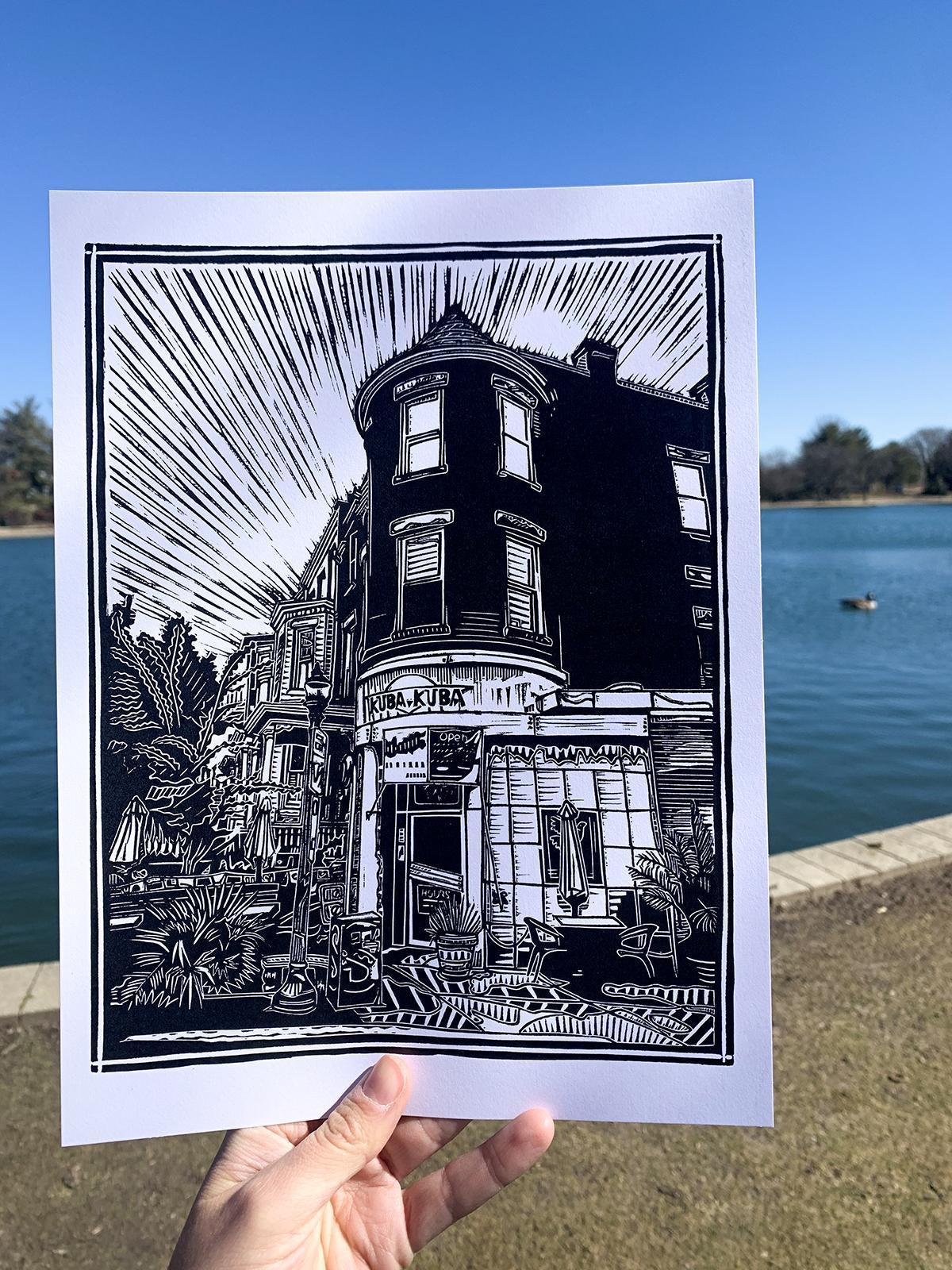 The original K.K. Restaurant block is retired! There will be no more linocut prints made. This is a high quality digital printed by Uptown Color, a local print shop here in Richmond, VA.