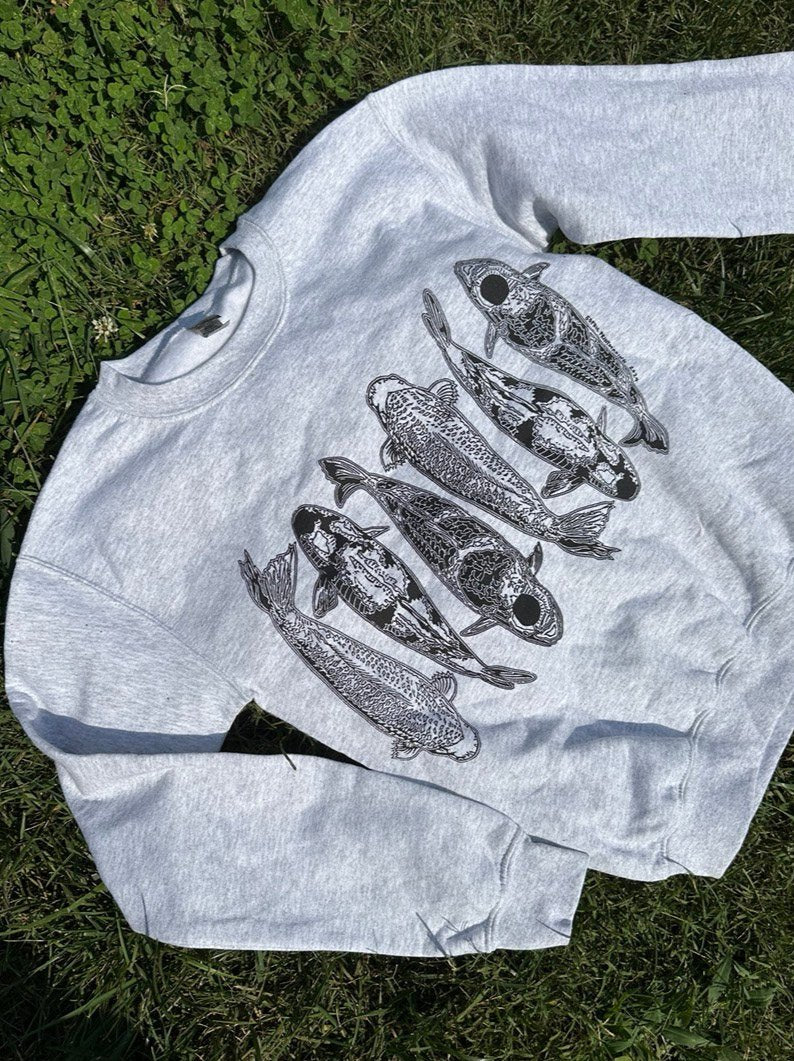 The front of this crewneck has the Koi Fish image screen printed in black ink. These shirts are printed by hand so minor differences occur in each individual shirt.