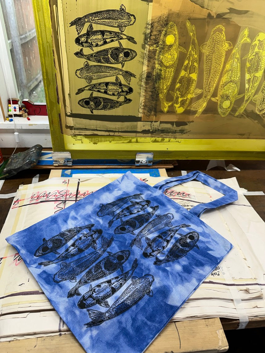 Screen printed 100% cotton tote bag with Koi Fish Image printed on one side.