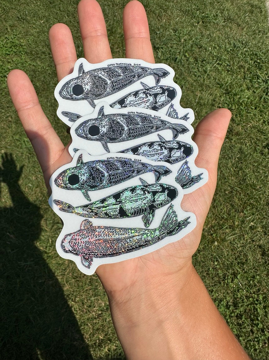 Glitter Stickers featuring 3 different koi based on linocut prints.