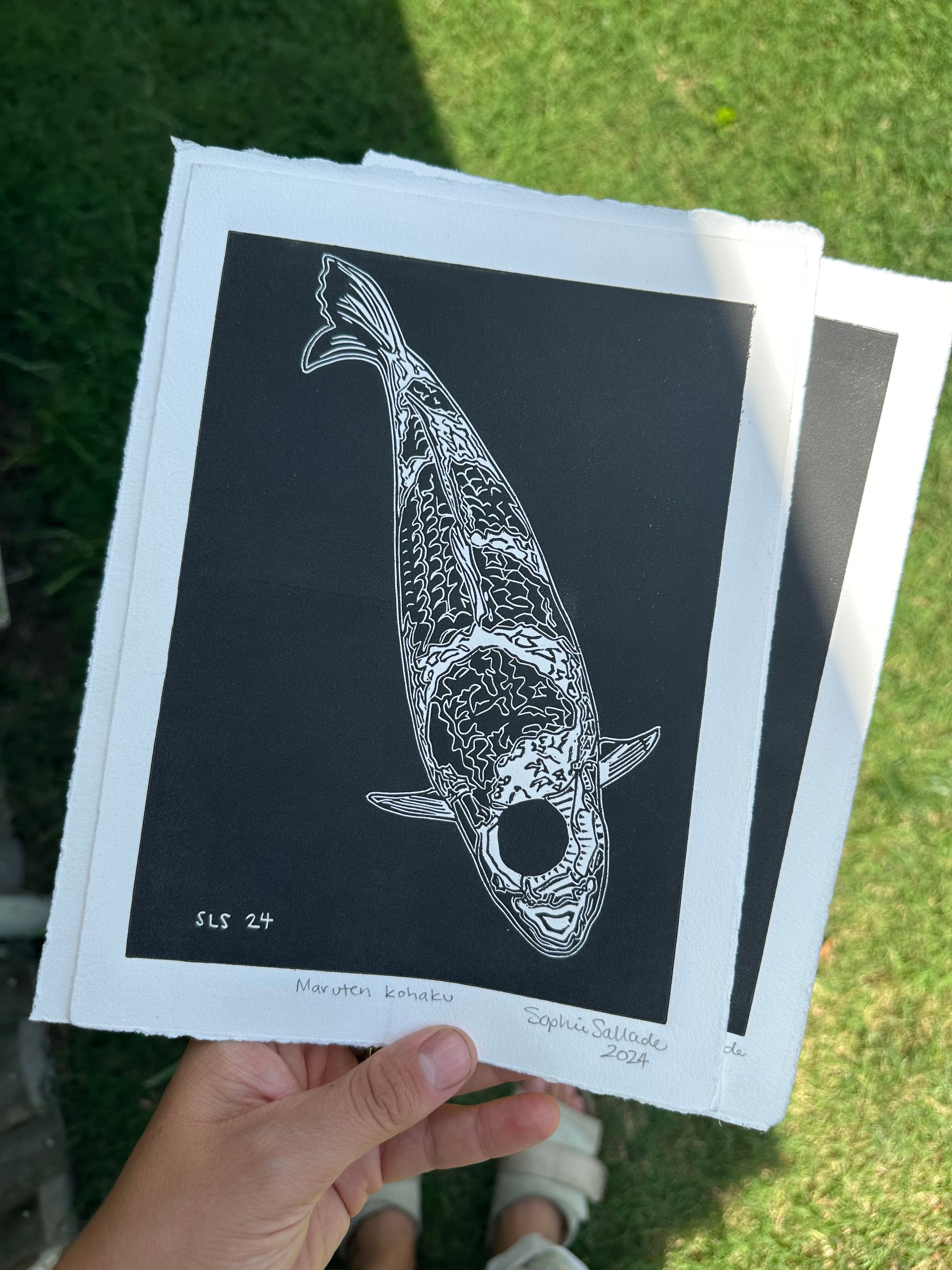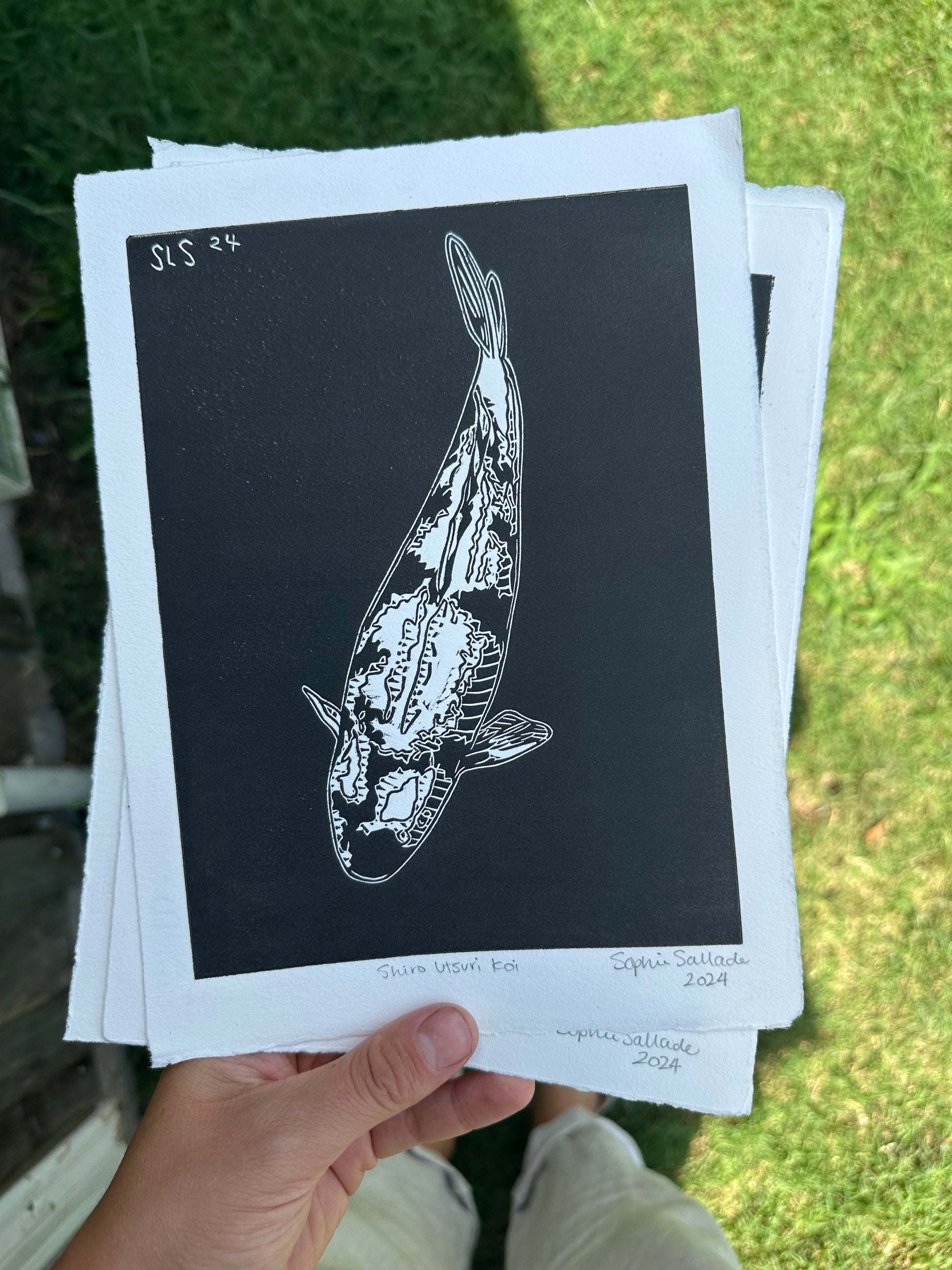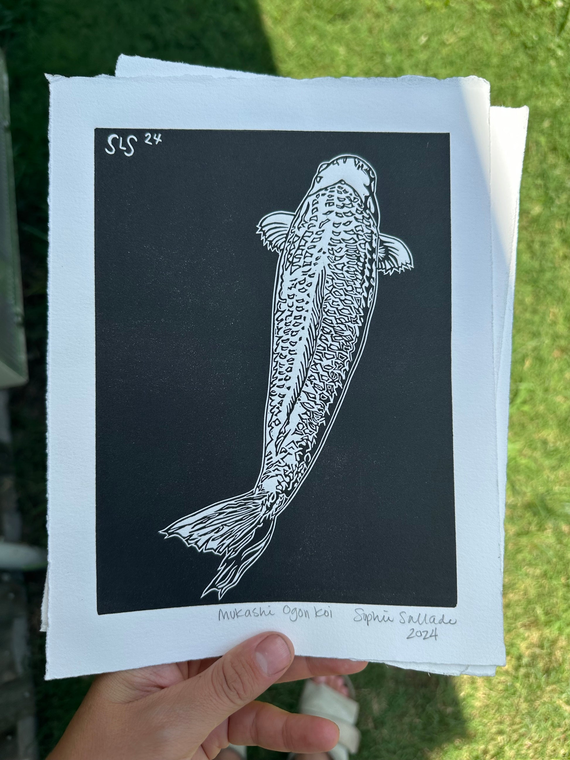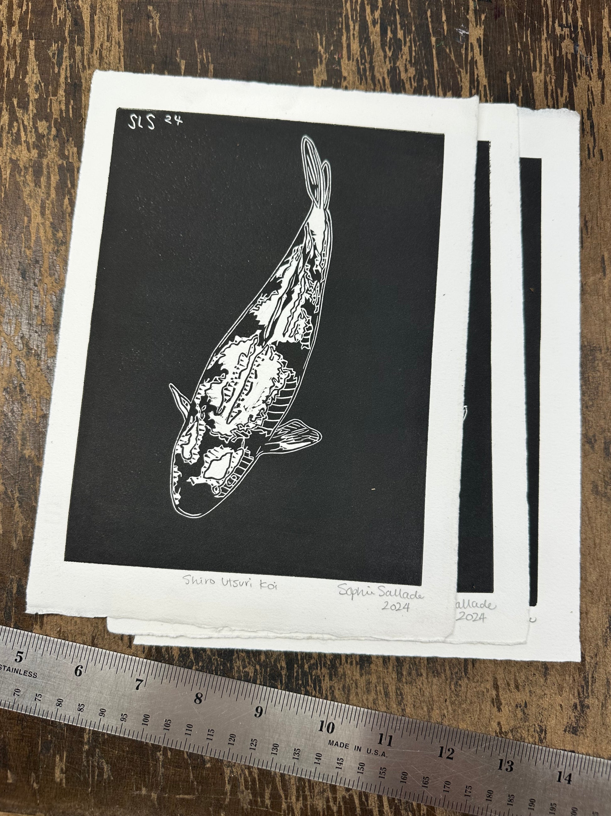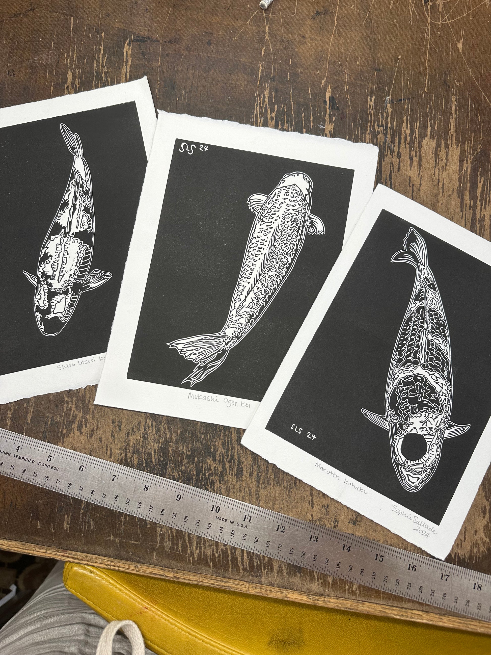 Buy one, buy two, buy all three! KOI linocut prints carved in 2024 for KOIFEST. These were the carved beginnings of my screen printed koi poster.