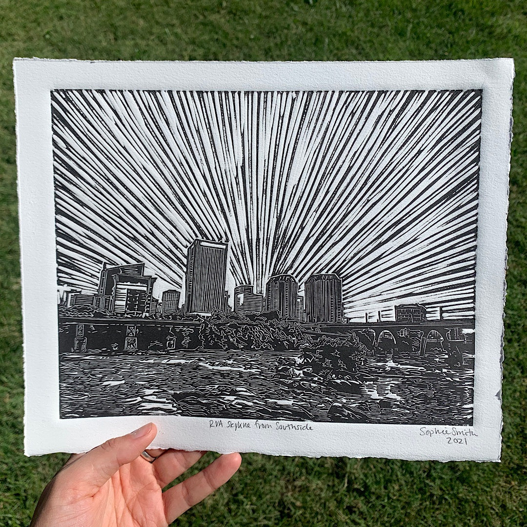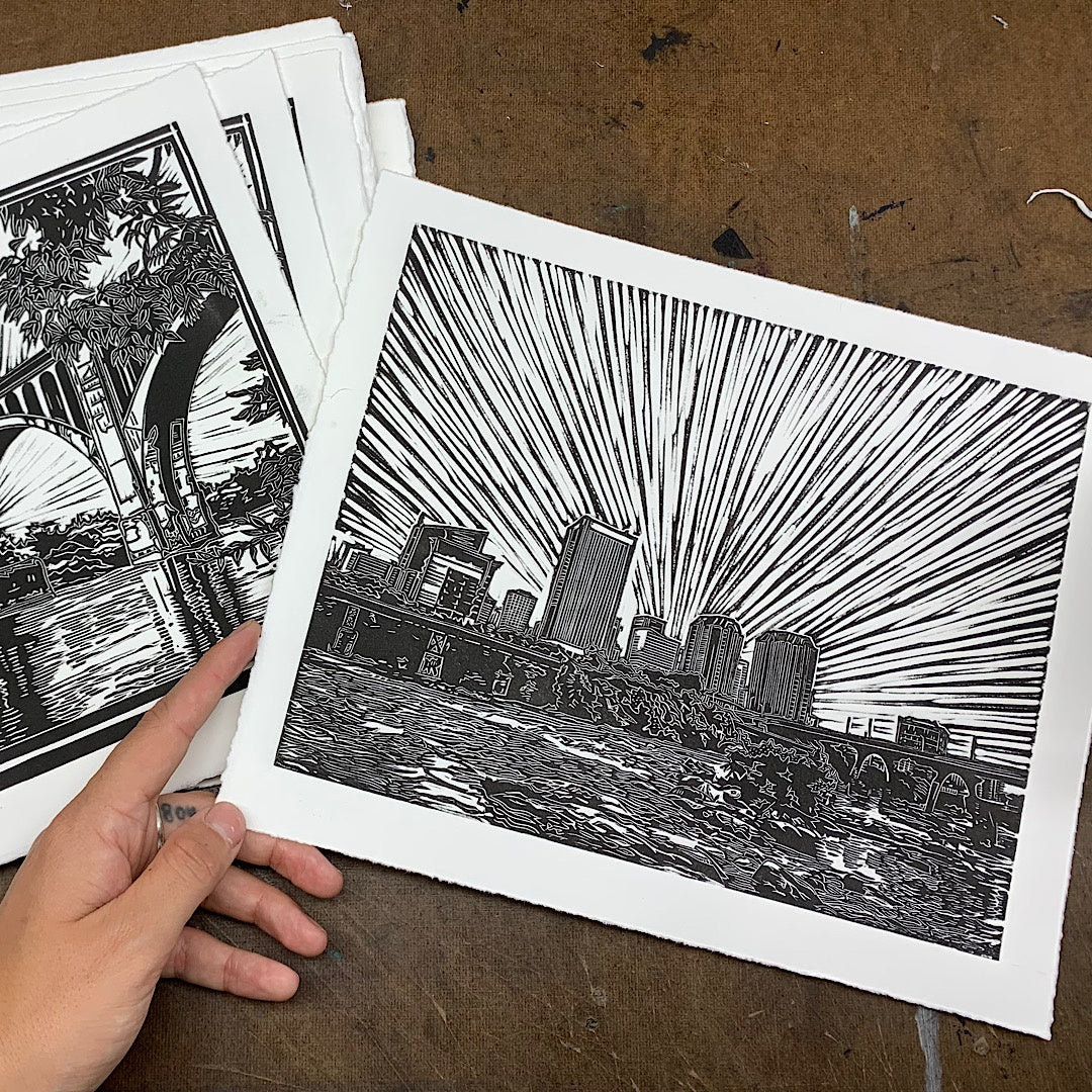 This is an 8X10”(ish) print was the inspiration for the Jason Isbell screen-printed concert poster, and is also its very own very special linocut print! The image shows the city if Richmond, VA perched over the James River!