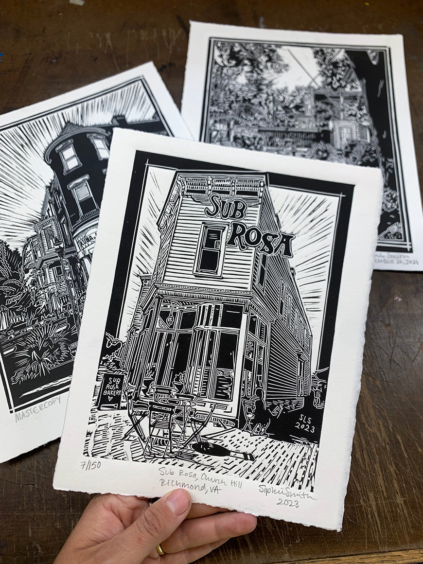 Sub Rosa Bakery is located in the Church Hill Neighborhood of Richmond, VA. This linocut image was carved by hand, and printed using Speedball Oil Based Ink. Titled, editioned & signed by the artist in pencil.