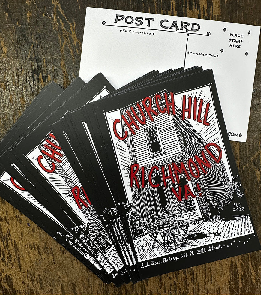 This postcard depicts a linocut print of a popular bakery in Church Hill- Sub Rosa.